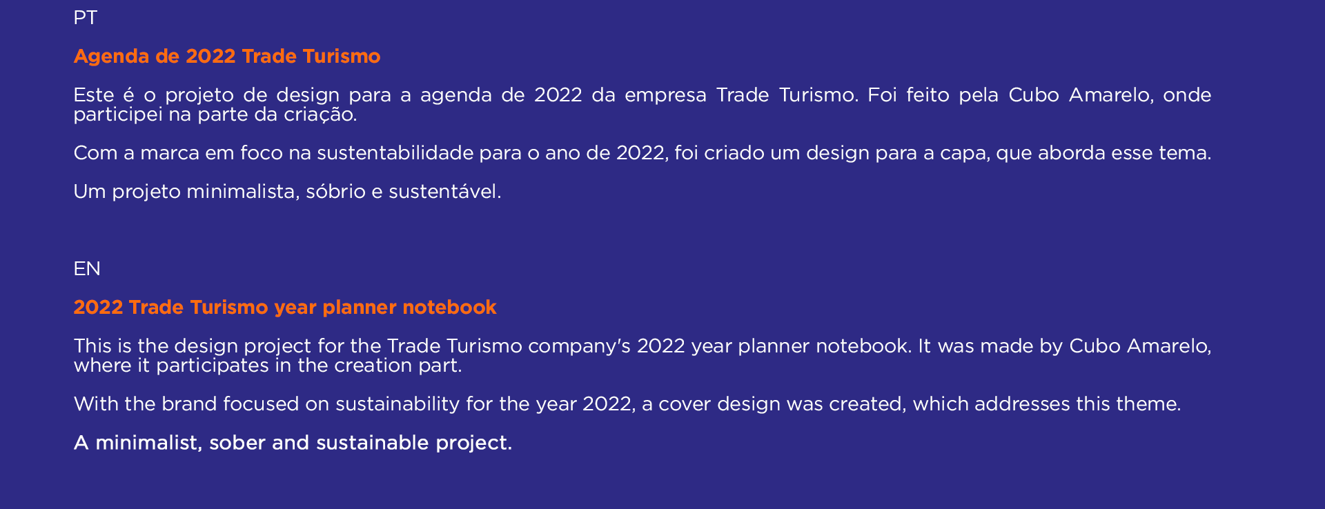 Este é o projeto de design para a agenda de 2022 da empresa Trade Turismo. Foi feito pela Cubo Amarelo, onde participei na parte da criação.